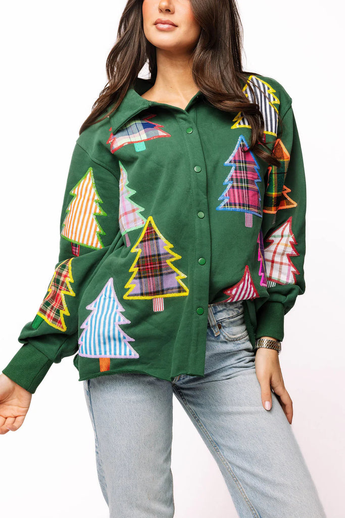 Dark Green Multi Plaid & Stripe Christmas Tree Button Up Shacket